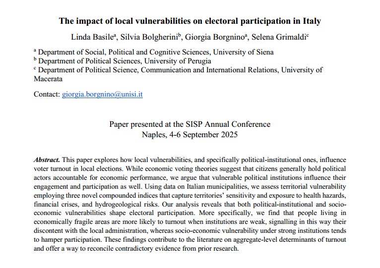 Empirical research has long shown that voting behaviour is affected not only by individual-level factors but also by spatial differences. Regional inequalities and rural-urban divides are, for instance, identified as key drivers of populist voting and electoral turnout. Much less is, however, known about the relationship between territorial vulnerabilities and electoral behaviour. Indeed, while several scholars have examined specific vulnerabilities at the individual level (i.e. vulnerable social groups), little attention has been given to the role of territorial fragility. This paper aims to fill this gap by exploring how the vulnerability of (local) territories affects electoral turnout.